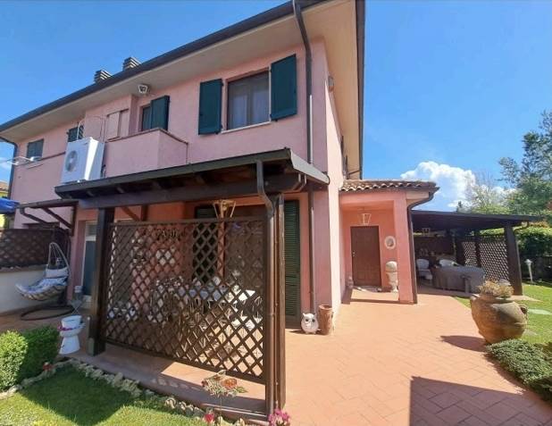 Villa quadrifamiliare su due piani fuori terra composta al piano terra da soggiorno, cucina, wc sotto scala e dal giardino esclusivo. Tramite scala interna di collegamento si accede invece al piano primo composto da disimpegno, tre camere e due bagni.Esternamente in corrispondenza delle aperture poste al piano terra sono presenti tre diversi porticati. Sulla pertinenza esterna insiste anche un ripostiglio prefabbricato in legno.L'accesso all'unità immobiliare avviene dalla pubblica via pubblica attraverso cancello pedonale e passaggio sul giardino esclusivo. Oltre ad un locale garage.