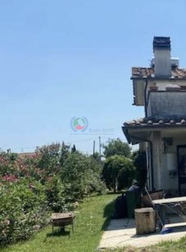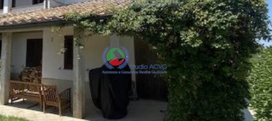 IN ASTA: Villa bifamiliare con annesso resede esclusivo, e ampio terreno agricolo prospiciente al fabbricato, attualmente adibito a giardino, così composta: al piano terra da soggiorno, cucina, disimpegno che articola ad una camera, un bagno ed uno studio, oltre tre portici/loggiato; al piano primo, raggiungibile da scala interna, disimpegno, una camera con terrazzo, un bagno e due locali sottotetto non abitabili, una terrazza sul lato nord, il tutto oltre resede esclusivo su tre lati.